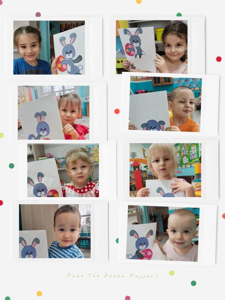 Аппликация: «Қоян». Мақсаты: Балалардың қоян туралы, оның сыртқы түрінің ерекшеліктері туралы түсініктерін кеңейту, балаларды қағаздан аппликация техникасында жұмыс істеуге үйрету; жеке бөлшектерден композиция жасау білігін жетілдіру; қолдың ұсақ моторикасын, көру, есту қабілетін дамыту; материалдарға ұқыпты және ұқыпты қарау дағдыларын қалыптастыру; дербестікке, төзімділікке, мұқияттылыққа тәрбиелеу.