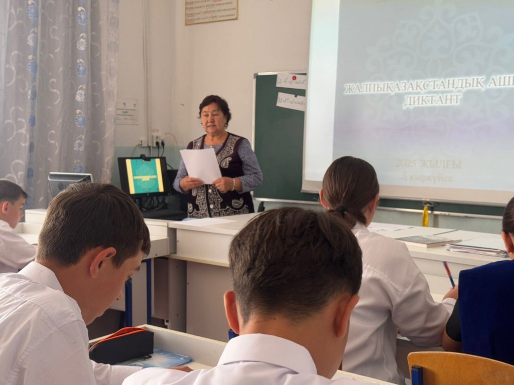 Абайдың тойы — жүз сексен жыл, Ұлтына қалдырған нұрлы із, жыр. Ойшылдың сөзі — мәңгілік мұра, Жастарға жол нұсқар даналық тума. Бүгінгі диктант — ел бірлігі, Жанымызға құйды ар ірілігі. Ұлының сөзі — шырақ, темірқазық, Болашаққа бастайды асыл қазық.